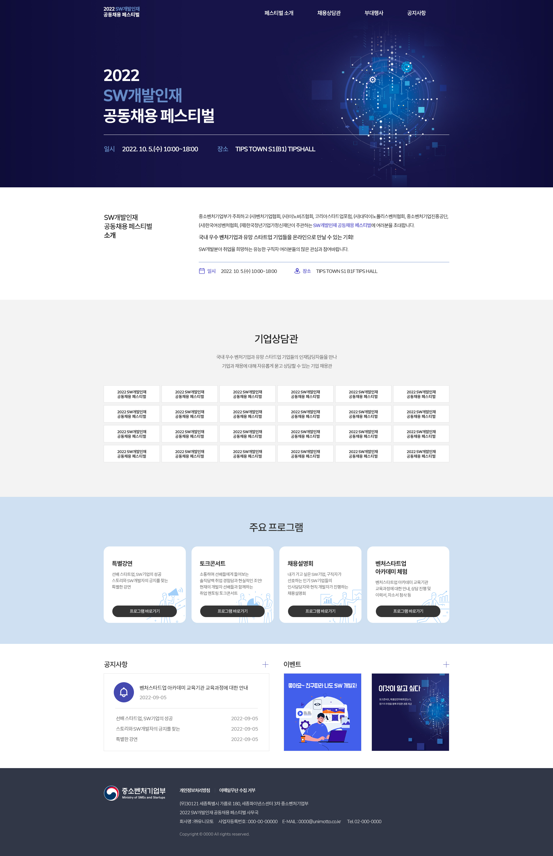 2022 벤처스타트업 인재매칭 페스티벌 중소벤처기업부가 주최하고 (사)벤처기업협회, (사)대덕이노폴리스벤처협회, (사)한국여성벤처협회, (사)중소기업기술혁신협회, (사)코리아스타트업포럼, (사)한국경영혁신중소기업협회가 주관하는 벤처스타트업 인재매칭 페스티벌