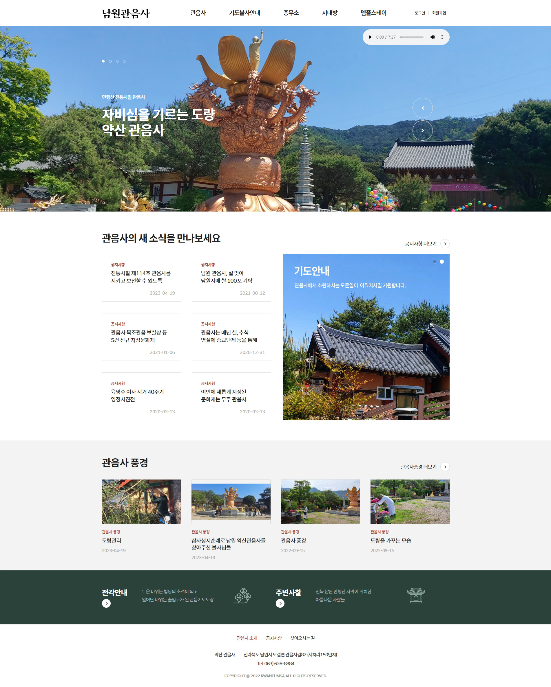 전통과 현대의 조화로움으로 지혜를 배우는 곳 기도와 수행으로 행복한 곳, 문화로 화합하고 소통하는 곳, 부처가 되는 곳이 바로 마음의정원 관음사입니다.