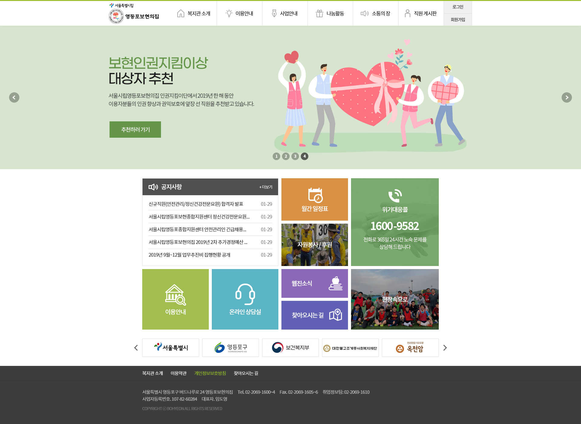 서울시립영등포보현종합지원센터는 사회복지법인 대한불교조계종사회복지재단이 서울시로부터 위탁받아 1998년 5월부터 운영하고 있는 노숙인복지시설입니다. 불교의 자비사상을 바탕으로 노숙인들에게 제2의 인생을 살 수 있도록 지원 및 지지하고 있는 자비나눔 현장입니다.