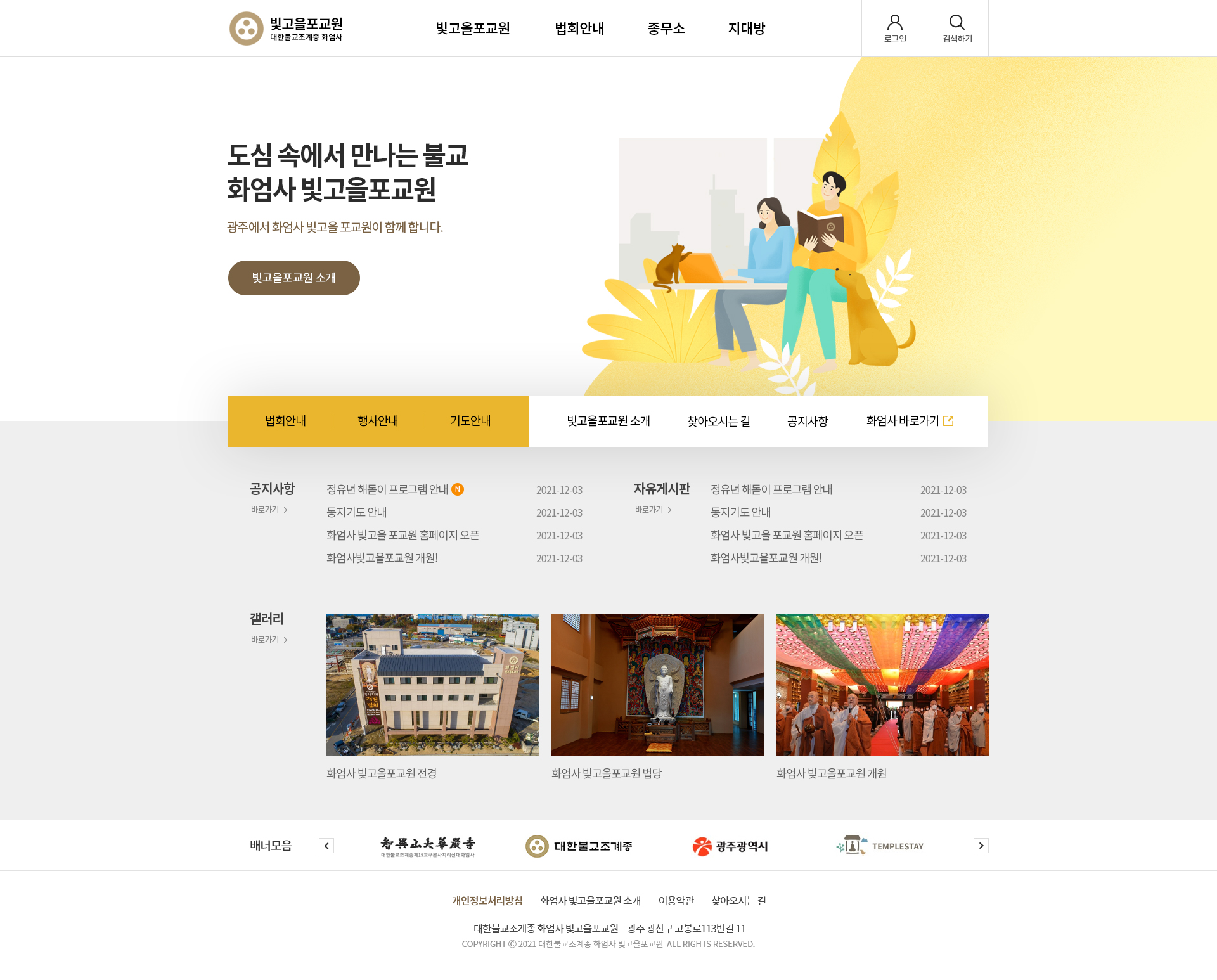 ‘화엄사 빛고을포교원’은 수행과 신행활동을 위해 전통적인 법당형식을 갖추되, 현대인들에게 맞는 편안하고 안락한 교육과 휴식의 도량으로 설계되었습니다. 이 도량에서는 누구라도 불교를 쉽게 접하고 생활 속에서 실천할 수 있는 다양한 신행프로그램을 체험하실 수 있습니다.